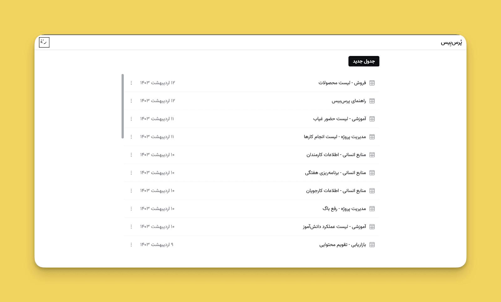 جدولهای ساختهشدهی شما در بخش جدولهای من قرار خواهند گرفت. از طریق منوی سمت چپ هر جدول میتوانید عنوان جدول خود را ویرایش کنید و یا جدول خود را حذف کنید. همچنین تاریخ آخرین ویرایش جدول، در این لیست قابل مشاهده است.
