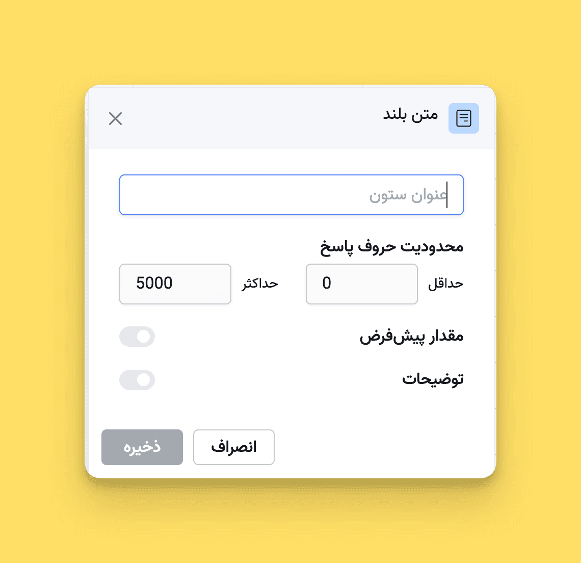 برای ساختن ستونها در جدول پُرسبِیس پس از انتخاب نوع ستون، لازم است فیلدهای مربوط به تنظیمات ستون را پر کنید.