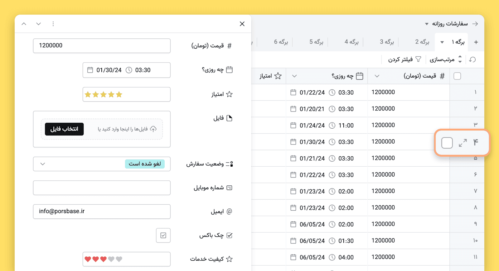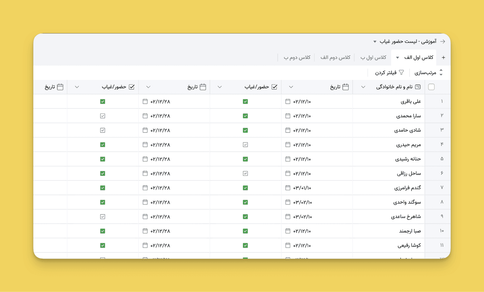 در هر جدول، میتوانید چندین برگه (tab) داشته باشید؛ مثل کلاسها در جدول لیست حضور غیاب. با استفاده از منوی هر برگه میتوانید نام آن برگه را تغییر دهید و یا آن را حذف کنید.